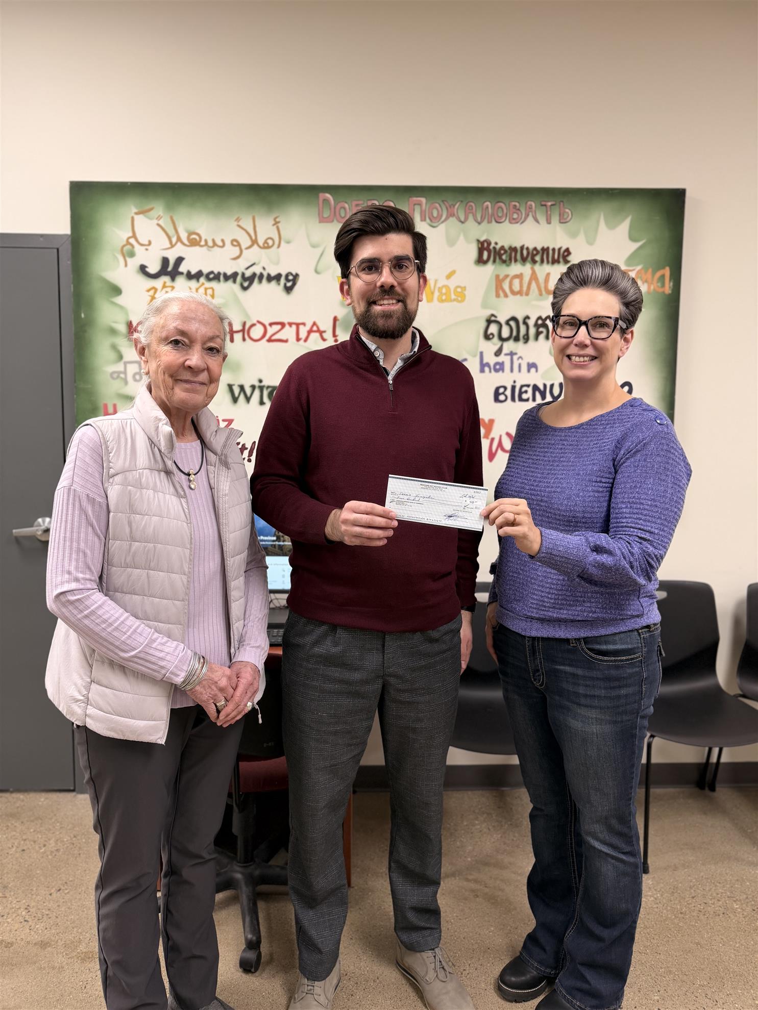 Cheque presentation to Saamis Immigration for $400 in support of a project that provides hygiene bags to women (newcomers). Pictured is Sammis' ED Kristijan Kopilovic with Sharon and Margie.