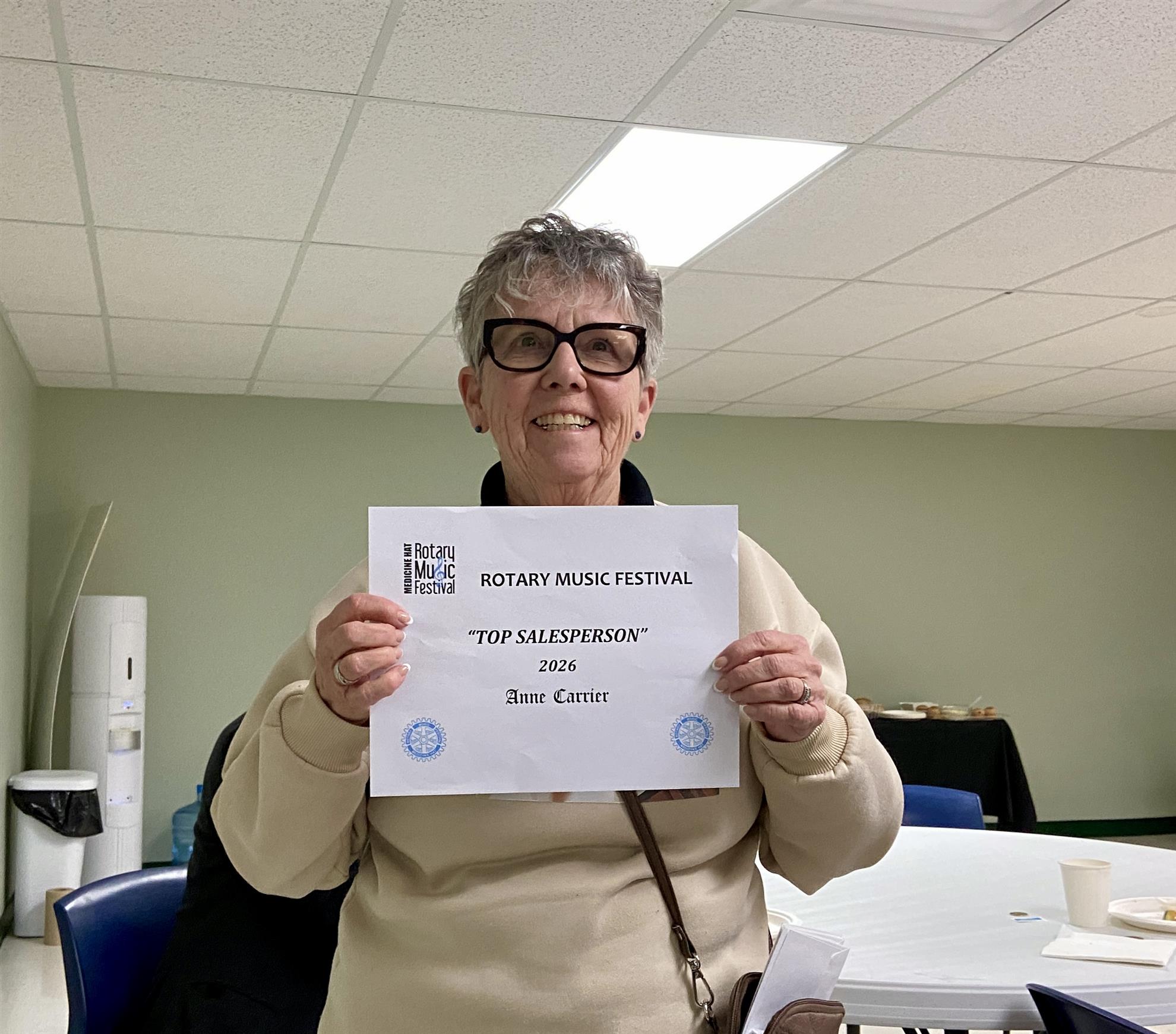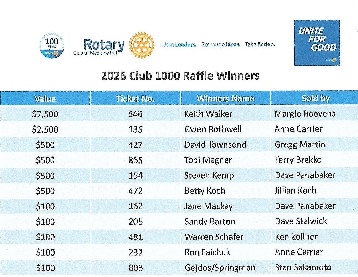 Also, President Milan recognized Rotarian Anne Carrier for her exceptional work on the 2026 Club 1000 raffle. She was awarded a fun certificate for being the largest ticket seller. As well, the winners of the 2026 raffle were announced and the club congratulates Keith Walker for his win of the big prize.