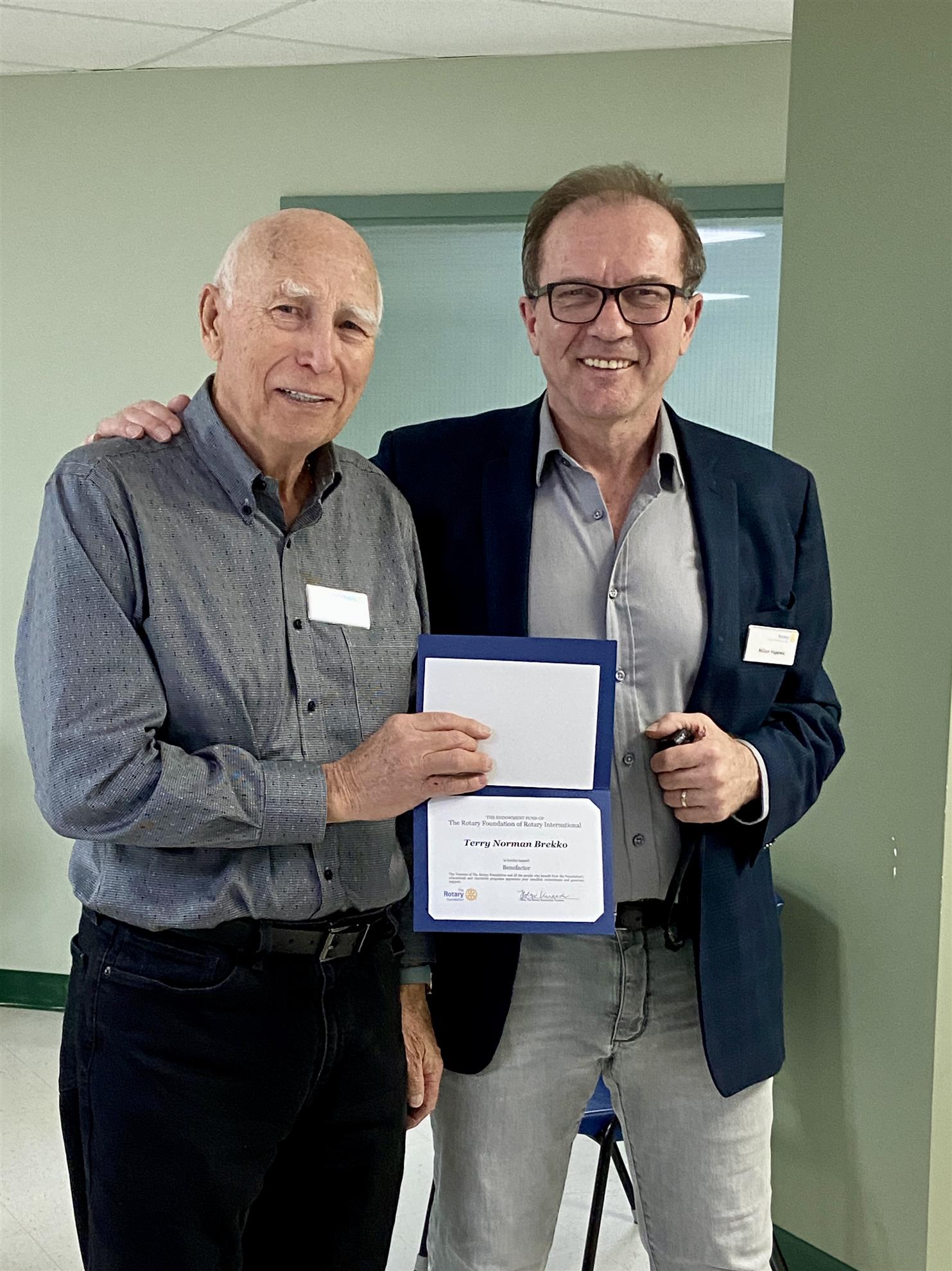 Several presentations were made today. President Milan was very happy to present Terry Brekko with a certificate from the Rotary Foundation, noting is faithful contributions to the Foundation. Terry took the opportunity to encourage all club members to consider "our" Foundation in their charitable giving plans. This money is returned to us in the form of District Grants, so we get back what we give. Congratulations Terry.
